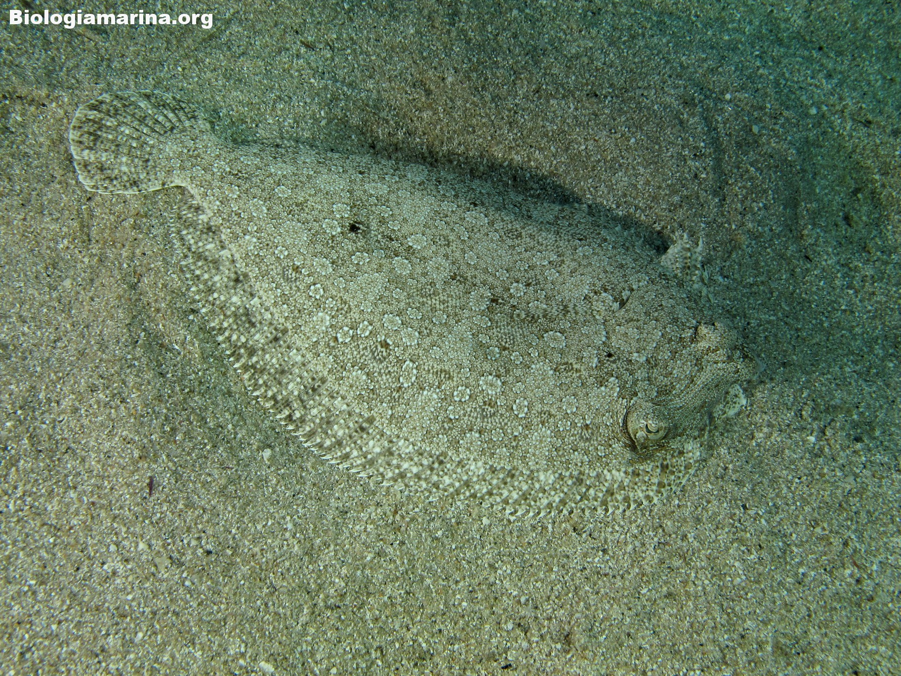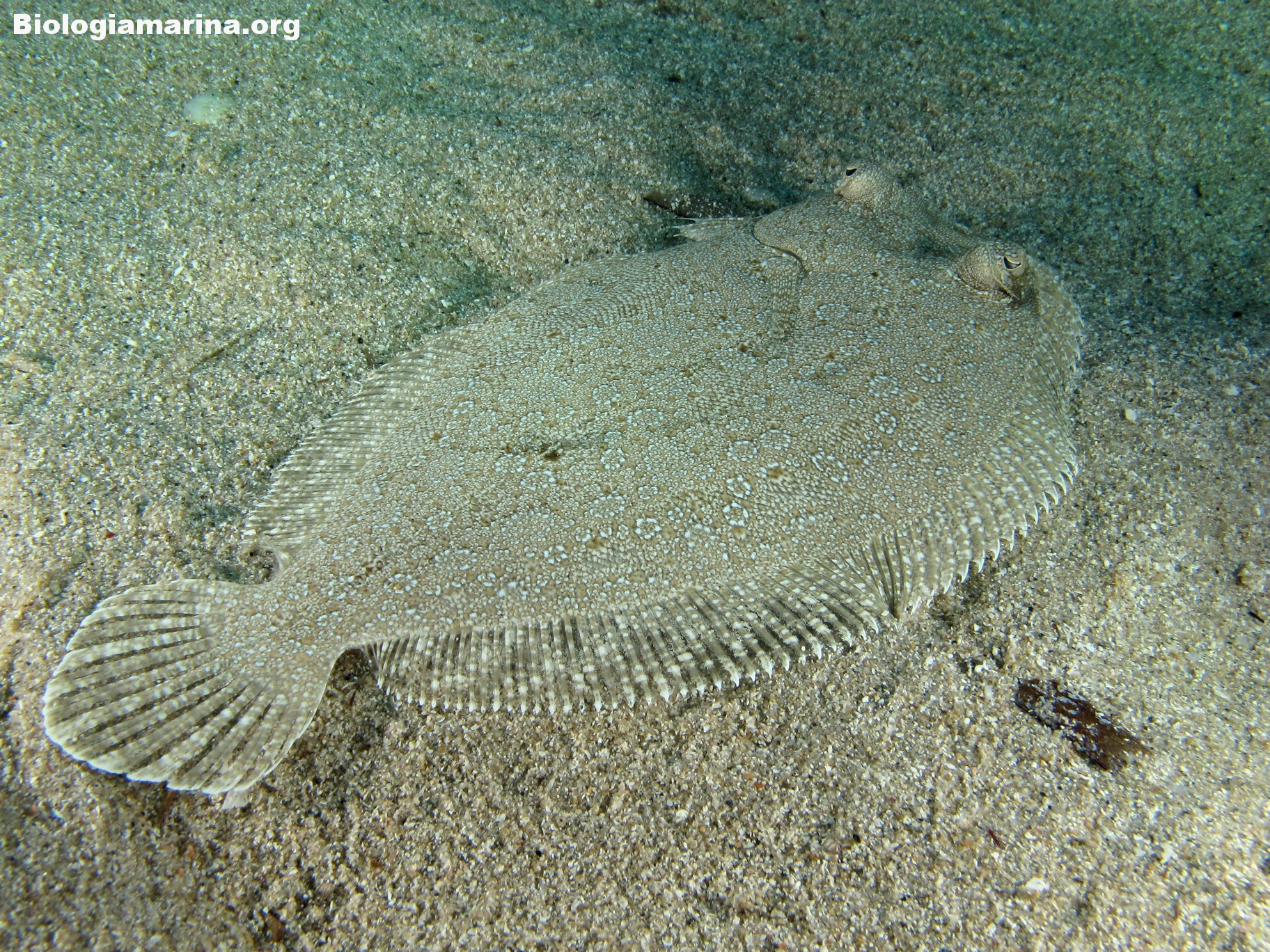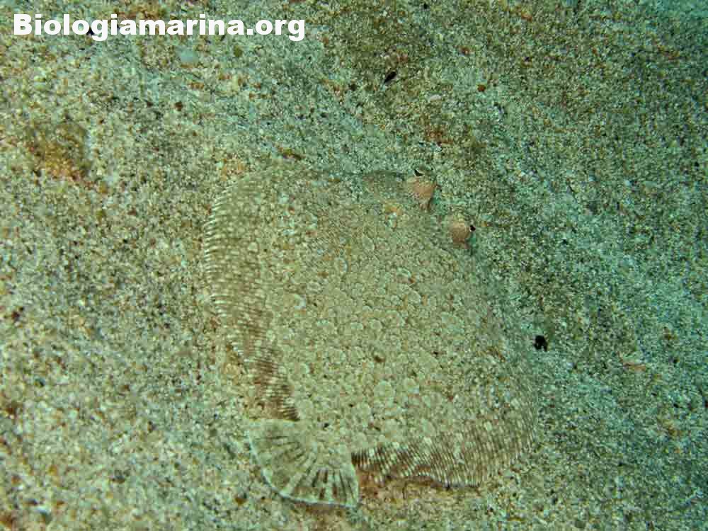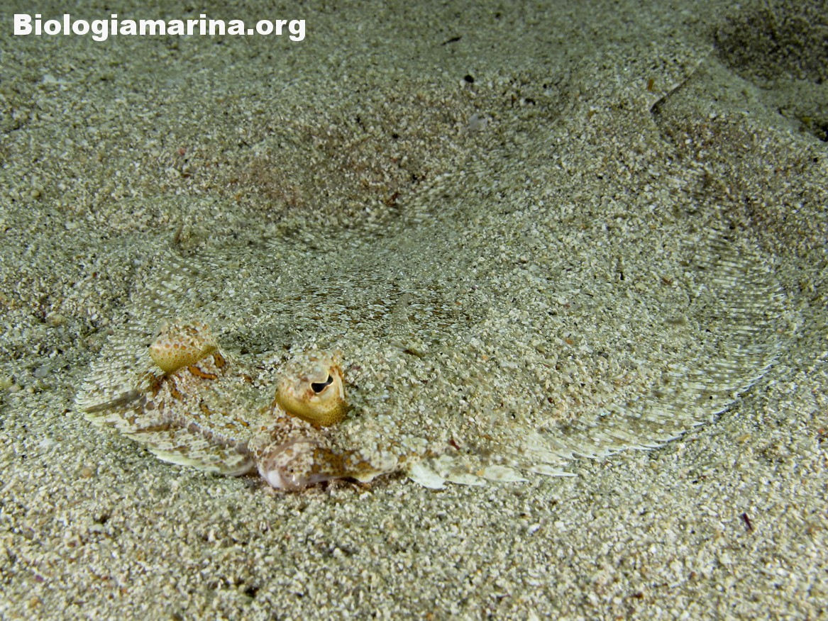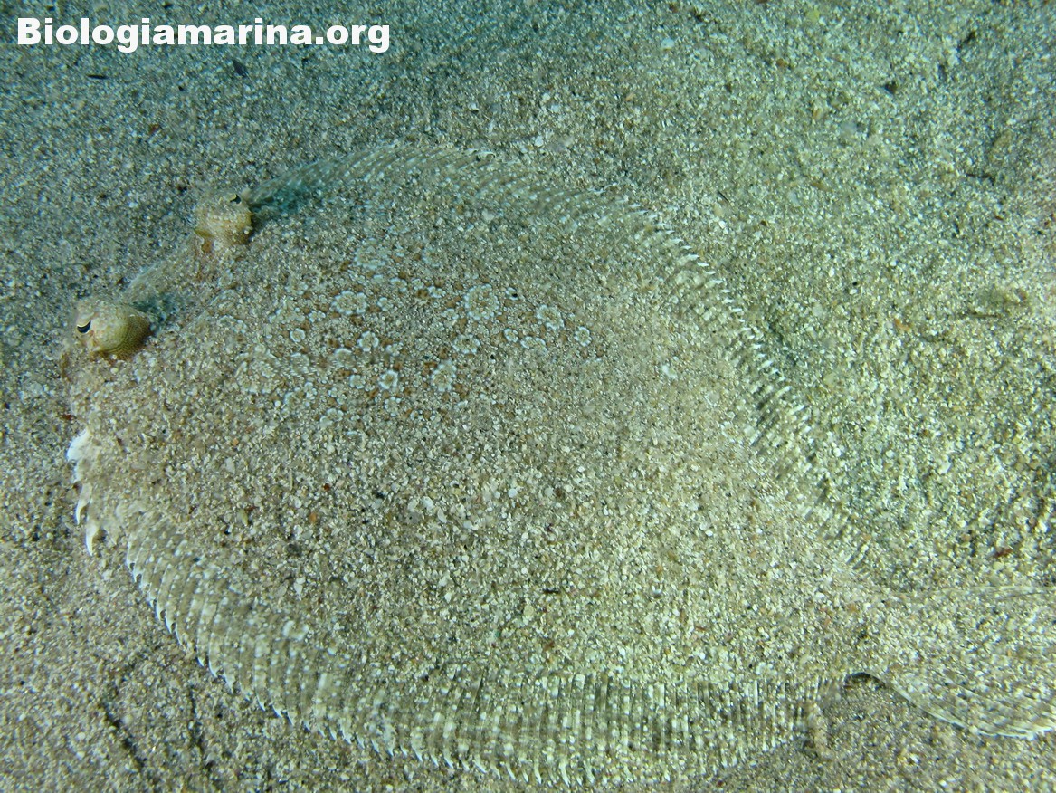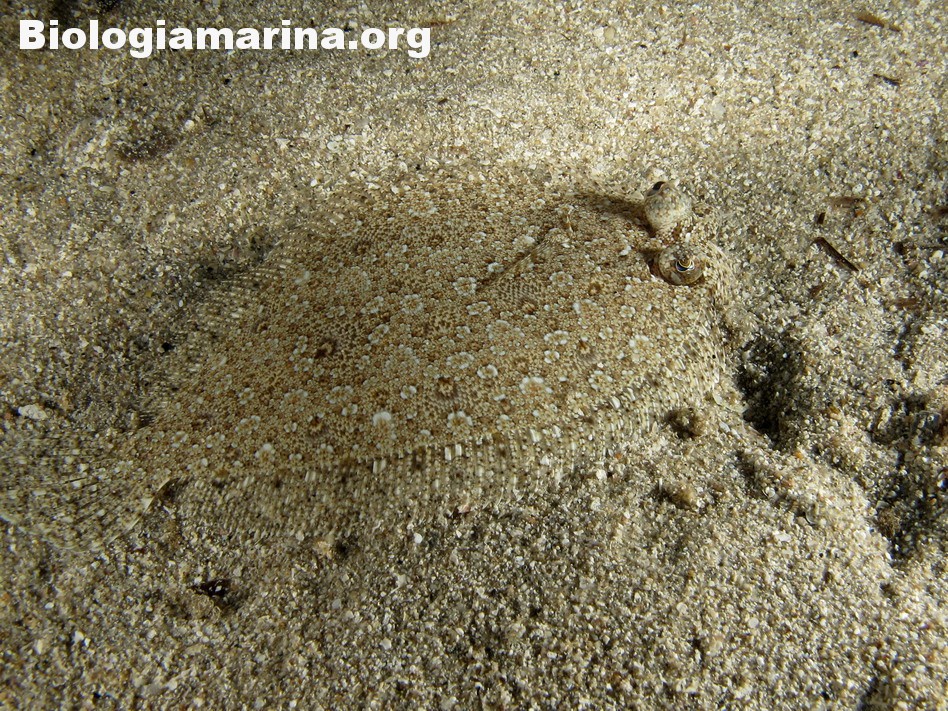 Il rombo di rena é pesce piatto sinistrorso rapidissimo nel nascondersi e mimetizzarsi sotto un sottilissimo strato di sabbia. Sono gli occhi sporgenti come due torrette periscopiche a tradire la sua presenza.