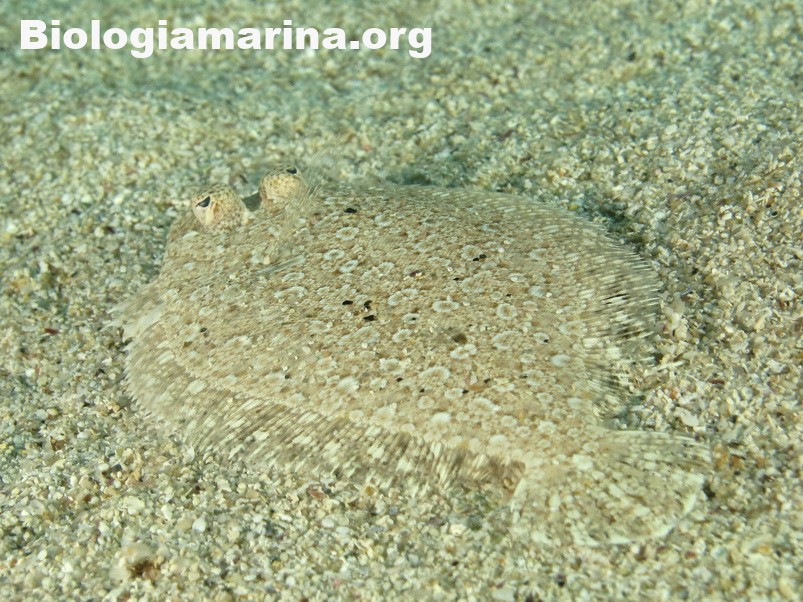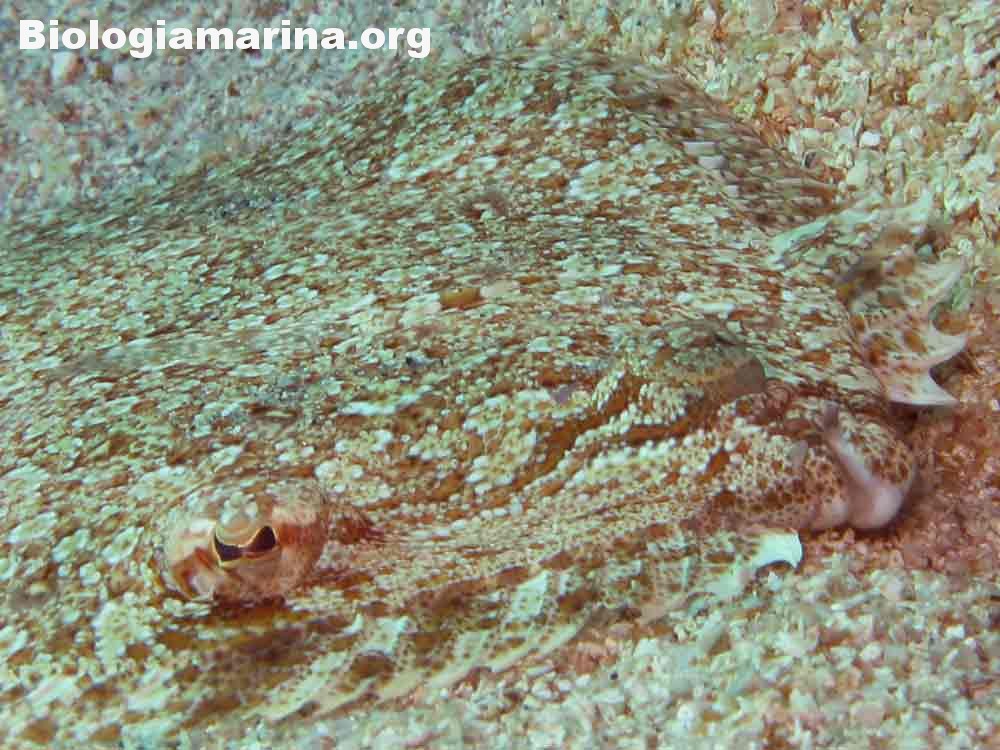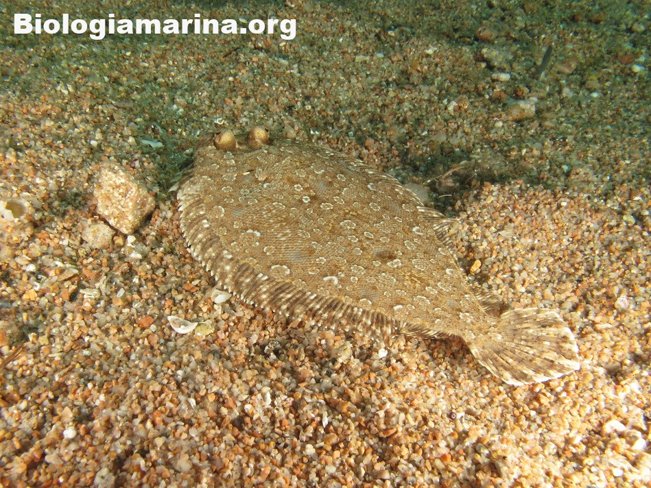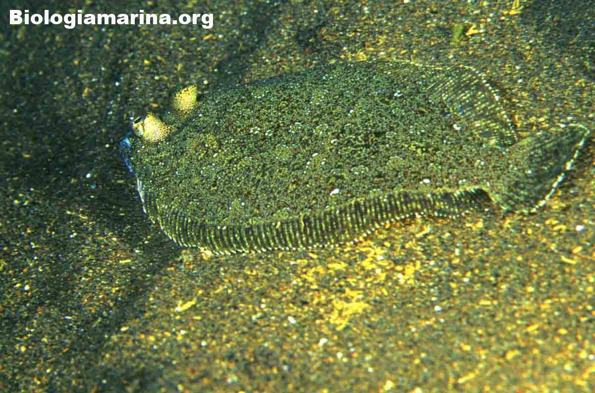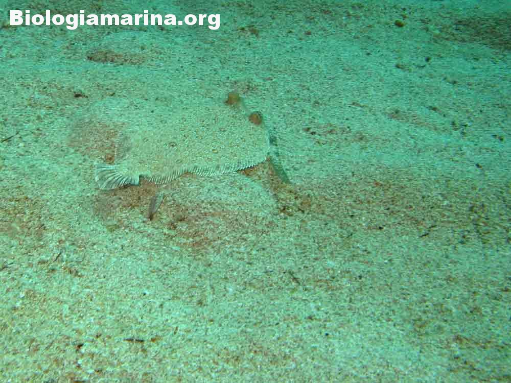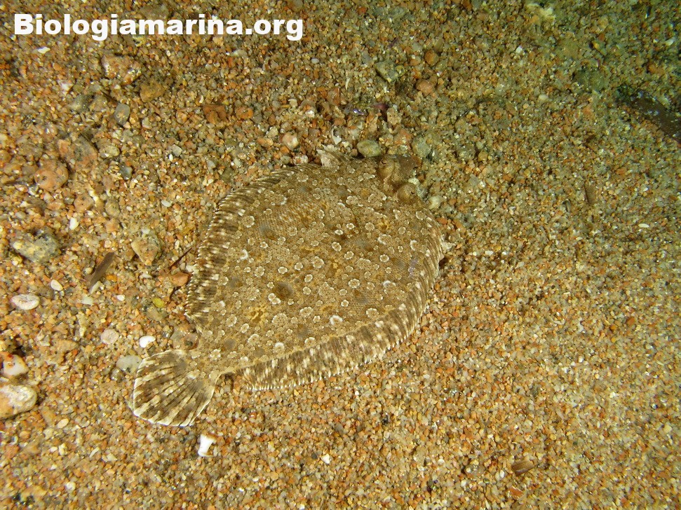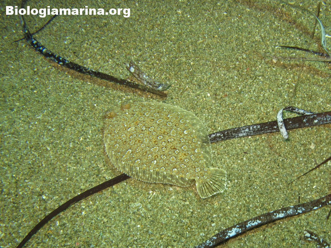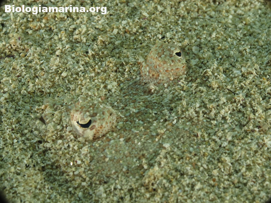 Il rombo di rena é pesce piatto sinistrorso rapidissimo nel nascondersi e mimetizzarsi sotto un sottilissimo strato di sabbia. Sono gli occhi sporgenti come due torrette periscopiche a tradire la sua presenza.