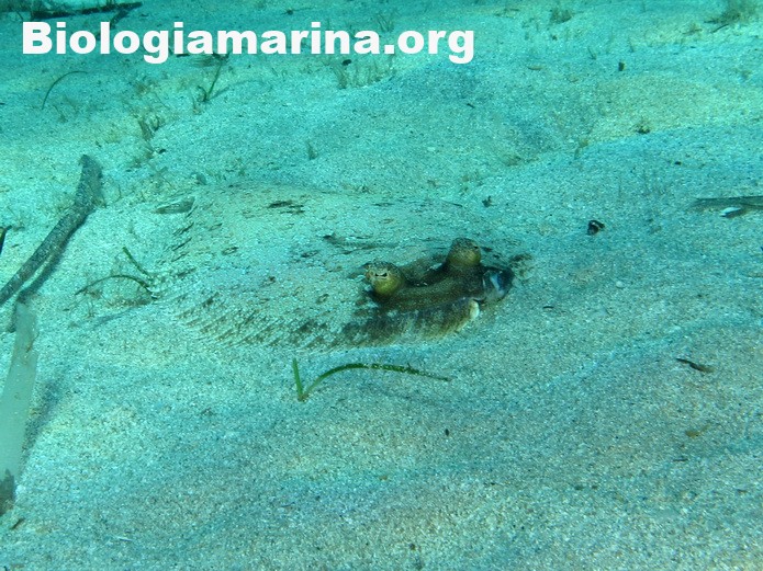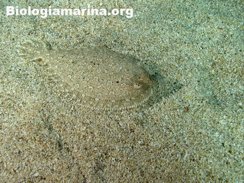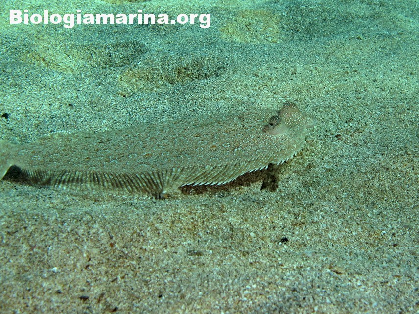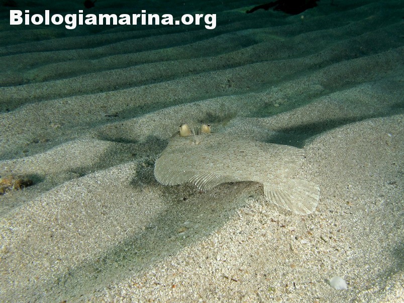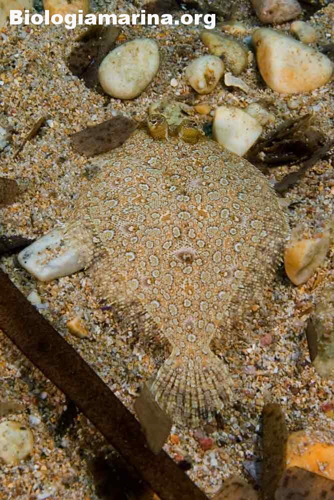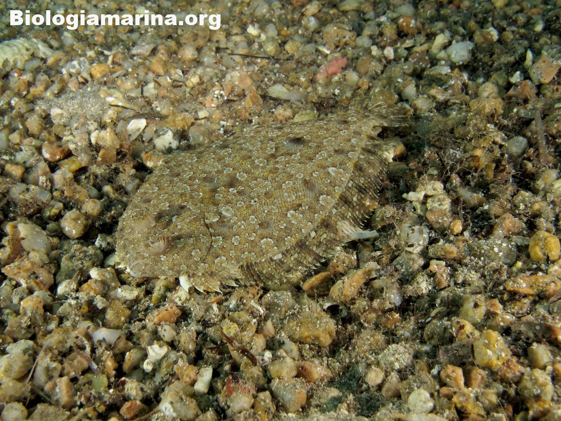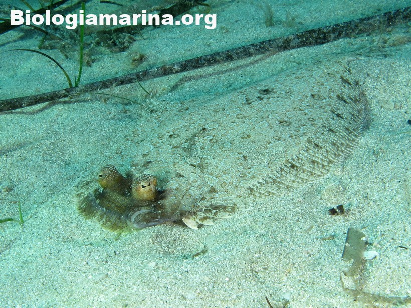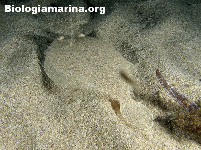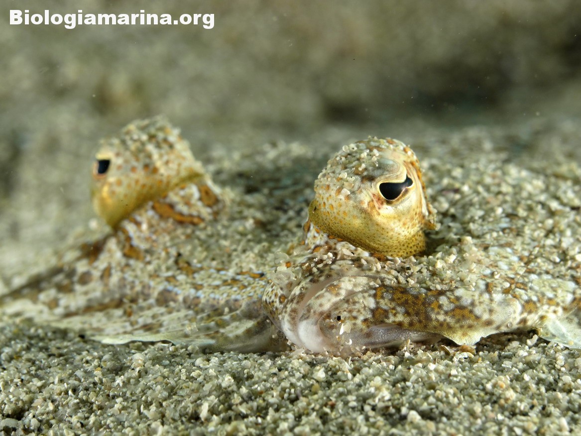 Il rombo di rena é pesce piatto sinistrorso rapidissimo nel nascondersi e mimetizzarsi sotto un sottilissimo strato di sabbia. Sono gli occhi sporgenti come due torrette periscopiche a tradire la sua presenza.