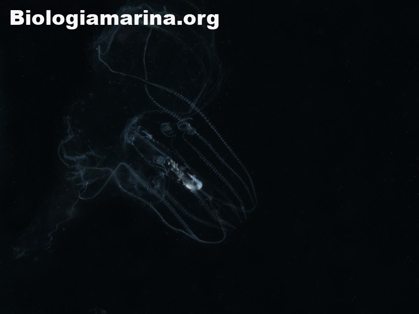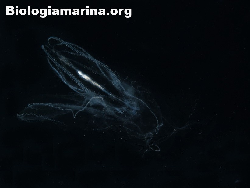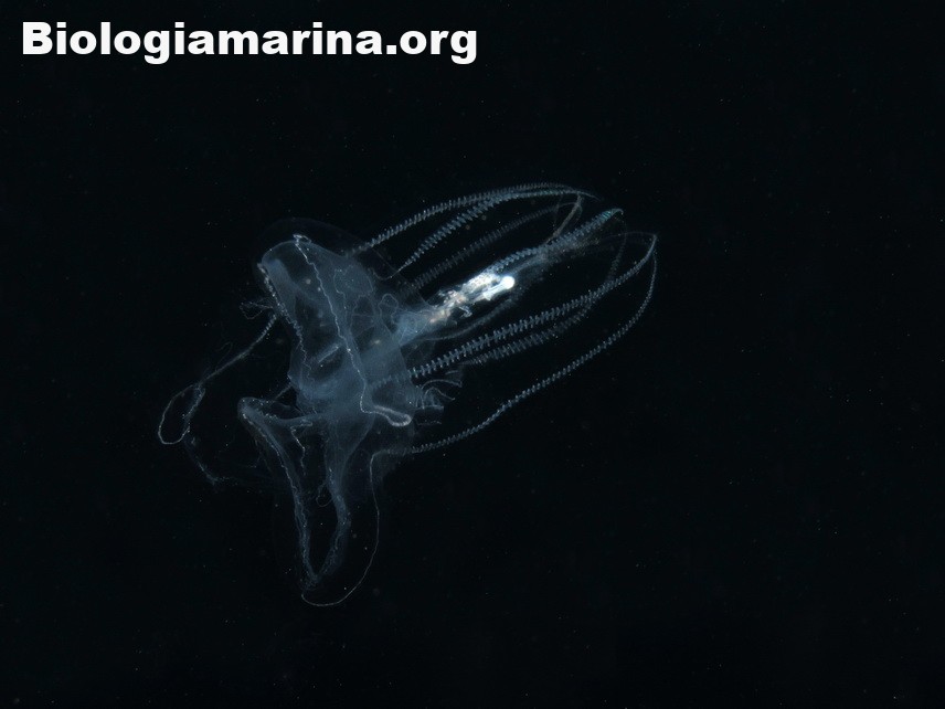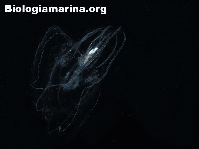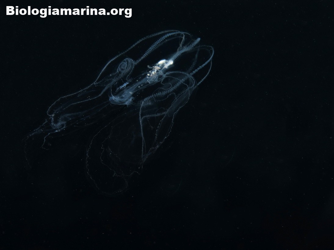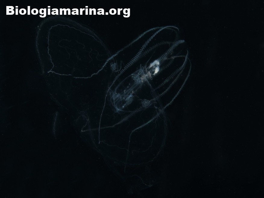 La Beroe velata meglio conosciuta come ctenoforo coi veli, appartiene appunto al philum degli Ctenofori che raggruppa organismi trasparenti e gelatinosi, tipicamente pelagici, il cui corpo è percorso da costole lungo le quali notiamo una serie di ciglia vibranti. Le ciglia sono disposte a pettine e da qui deriva il nome che equivale a “portatori di pettini”. Nei tentacoli o nei piccoli pettini, le cellule non sono urticanti ma adesive, e sono appunto queste cellule adesive dette “colloblasti” a catturare lo zooplancton di cui questi organismi si nutrono.