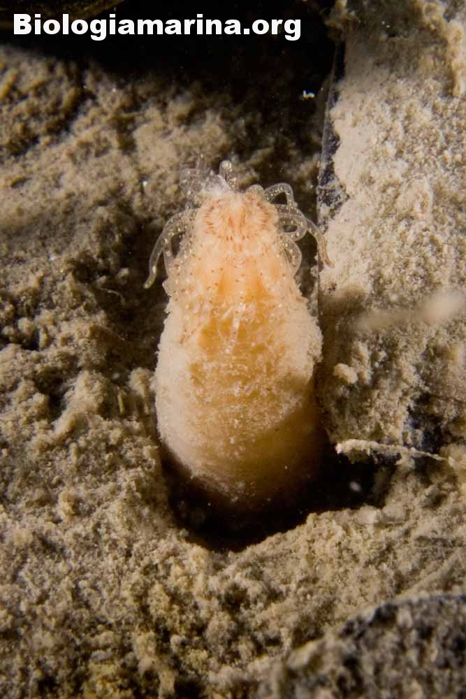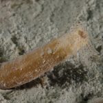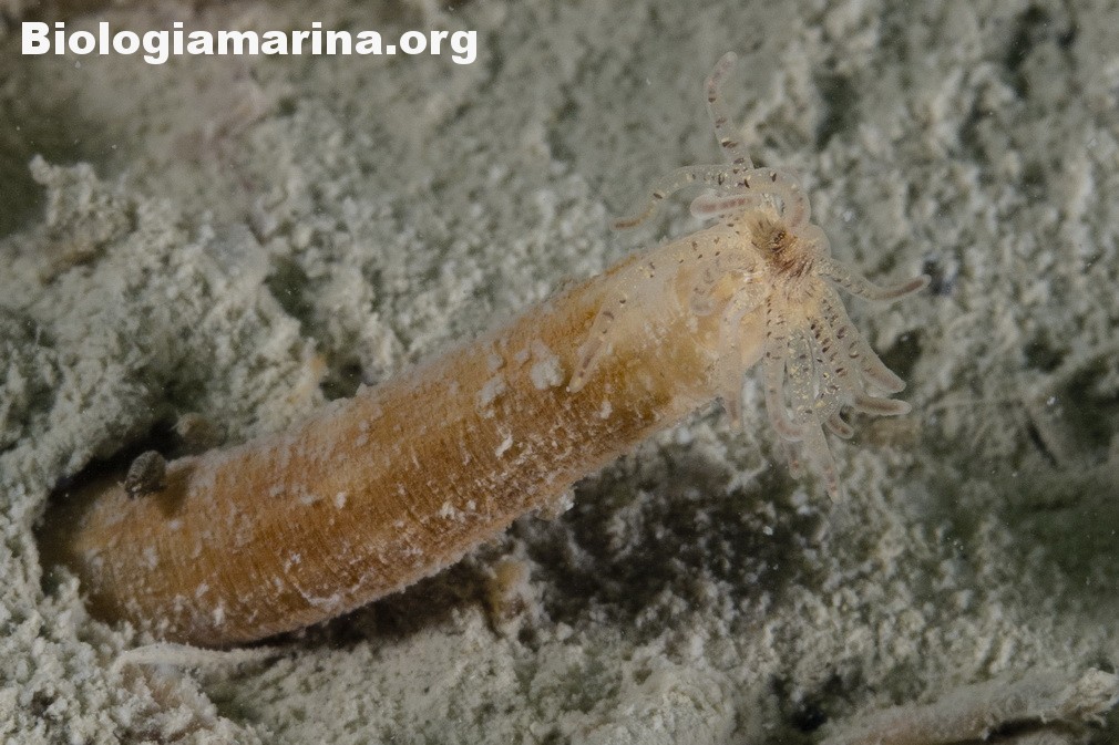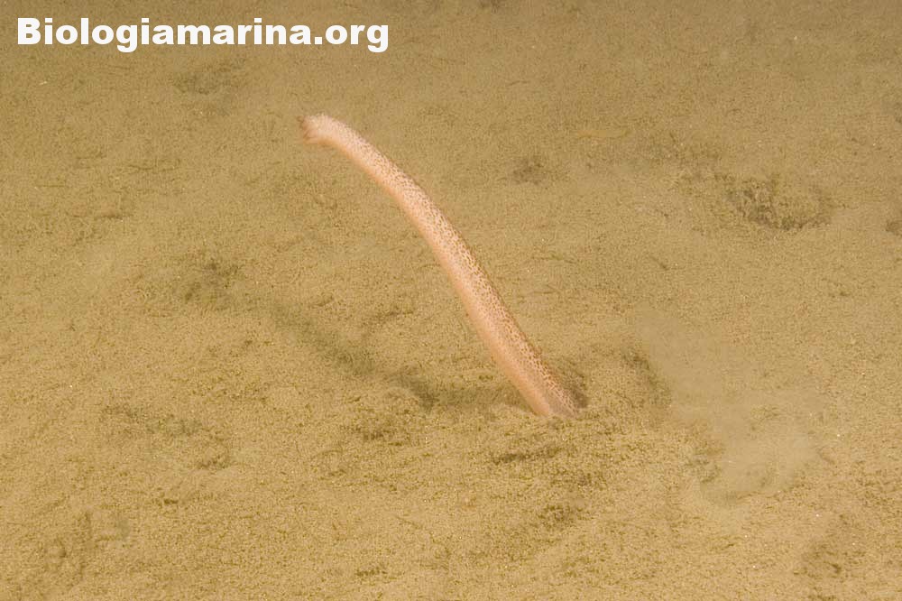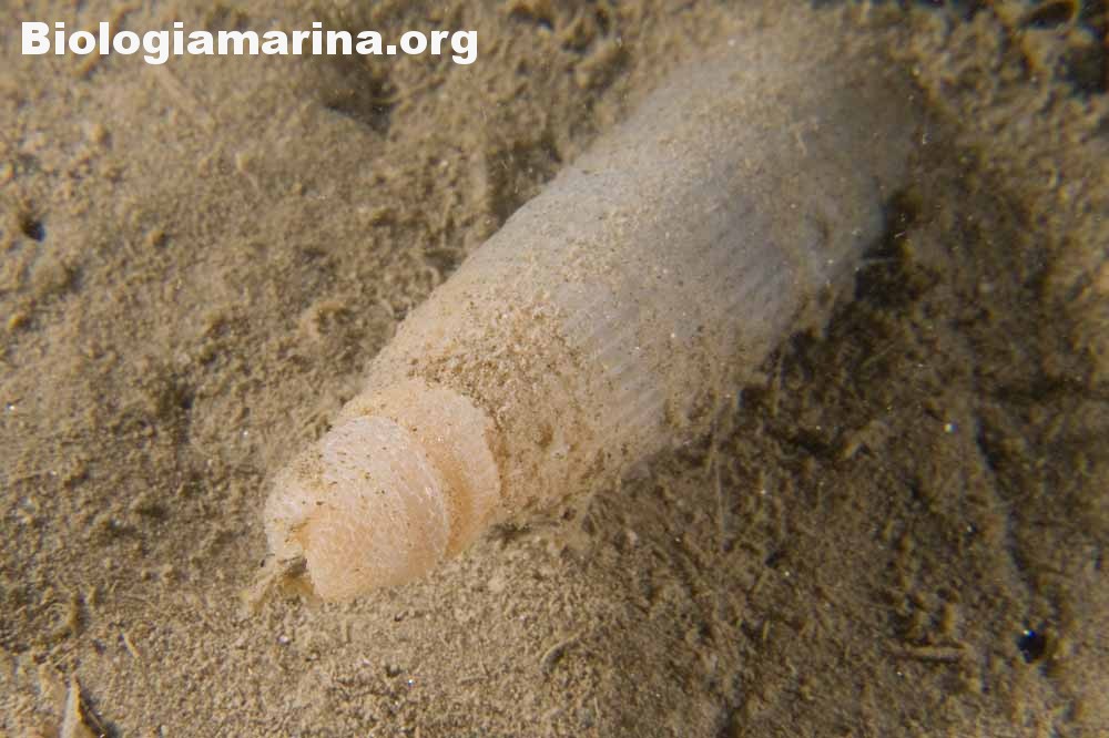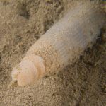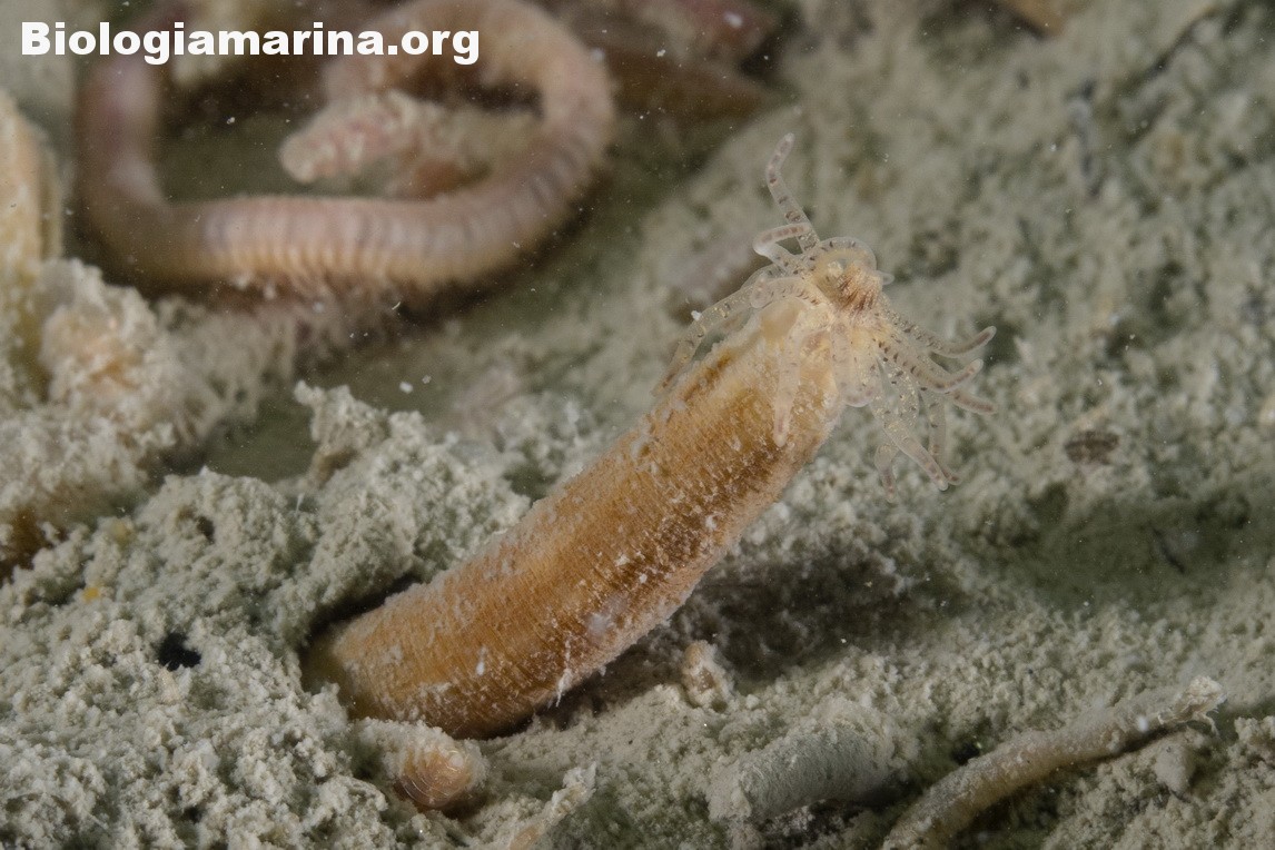 Il sipinculo nudo, stretto cugino minore del sipinculo fiscosoma è un “verme” di buone dimensioni, stanziale nella sua galleria nel sedimento, dalla quale sporge l’apparato boccale per la cattura del cibo.